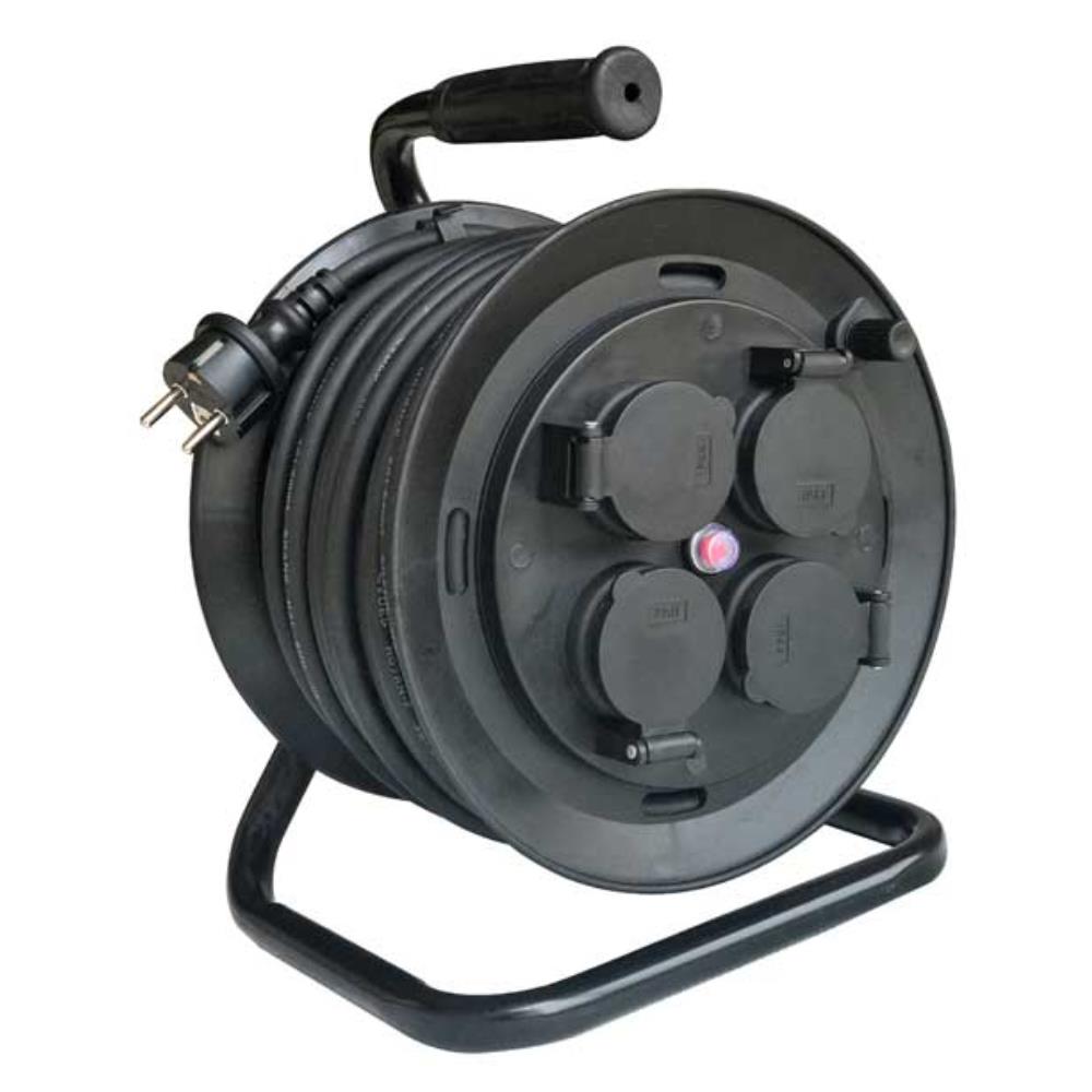 Kabelvinda med stålrörsstativ och handtag, kabel av gummi, RDOE-F 3G1,5mm² H07RN-F. Försedd med 4 st jordade uttag med lock. 220-250V~50-60Hz, 2P+E, 16A-6h. Godkänd för utomhusbruk IP44.