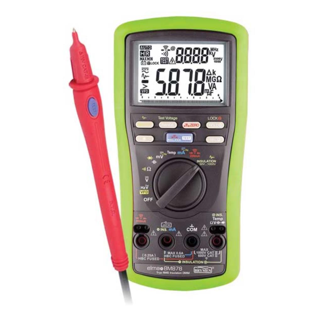 En äkta TRMS KAT IV multimeter med inbyggd isolationstestare. Isolationstestaren har fem valfria testspänningar. Instrumentet har dessutom en inbyggd 200mA ohmmeter för mätning av kontinuitet. Instrumentet mäter TRMS spänning, ström, frekvens, resistans, kapacitans, dioder kontinuitet och temperatur. Har en snabb, analog bargraf. Funktioner som bl.a. max/min, datahold, autoavstängning automatiskt/manuellt områdesval samt VFD-funktion, som gör att instrumentet kan mäta riktiga värden efter en frekvensomformare.
