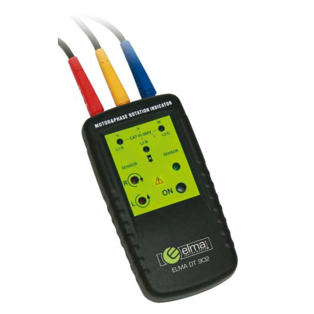 Elma DT 902 – Motorrotationsindikator med 3 funktioner. Visar rotationsriktning utan elektrisk kontakt. Elma DT 902 motorrotationsindikator är ett instrument för alla som arbetar med anslutning, service och kontroll av 3-fasmotorer. Instrumentets 3 funktioner: