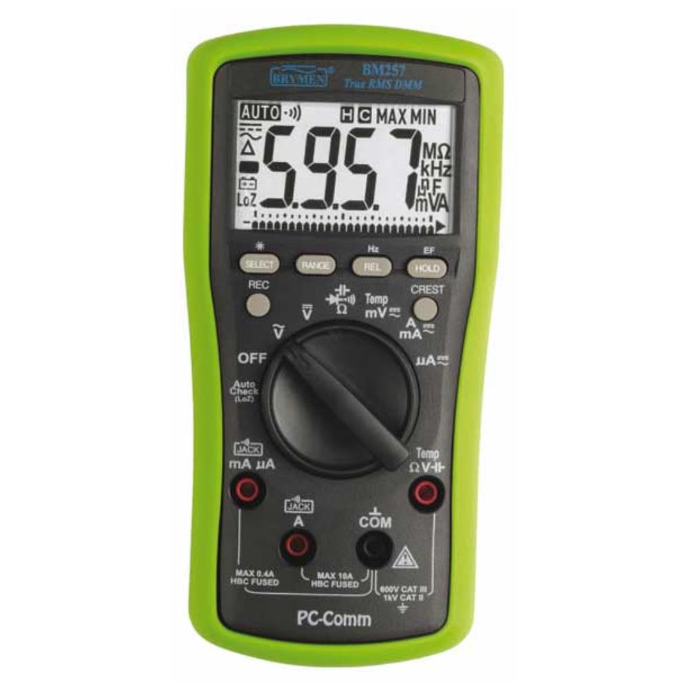 Elma BM 257 är minimultimeter med temperaturmätning som bjuder på två spännande nya funktioner. Auto Check är en intelligent funktion som automatisk detekterar och väljer AC- eller DC-spänning samt genomgångstest/resistans. Allt du behöver göra är att slå igång instrumentet och mäta. Low Z är spänningsmätning med låg impedans, det vill säga att mätpunkten belastas och därmed säkras att det är äkta spänning som mäts. Instrumentet har inbyggt beröringsfri detektering av elektriska fält som bl a kan användas till att detektera elektromagnetiska fält från datorskärmar eller som beröringsfri polsökare. Elma BM 257 mäter TRMS ström, spänning, resistans, frekvens, kapacitans, genomgång och temperatur. Elma BM 257 har belyst display med analog bargraf för enkel och snabb avläsning. Instrumentet är utrustat med automatisk/ manuellt områdeval, relativmätning, Peak hold, min/max, datahold samt intelligent autoavstängning. Med PC-kommunikationen och Windowsprogramvaran (extra tillbehör) är det möjligt att utföra online dataloggning. Instrumentet är mycket säkert och robust, tål felanvändning tack vare högeffektiva säkringar. Uppfyller IEC 61010-1 KAT III 600V.Elma BM 257 levereras komplett inkl. gummiskyddskåpa, testkablar, temperaturgivare (tråd) -50 till +250°C), batterier och bruksanvisning.