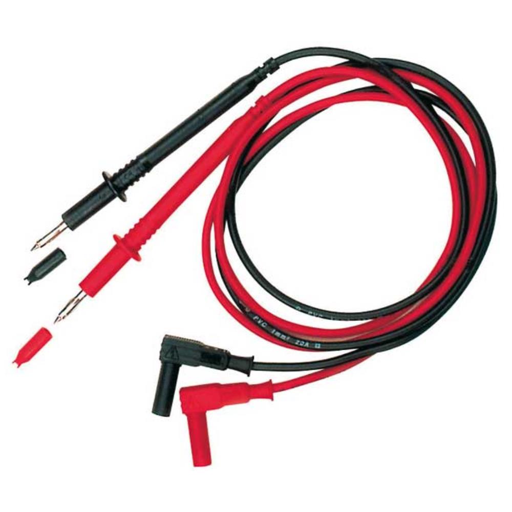 Set bestående av 1 röd och 1 svart PVC-ledning, 1 mm², 100 cm, försedd med 4 mm vinklade kontakter. Testpinne med 2 mm mätspets, även 4mm ”fjädrande” mätspets med möjlighet för montering av krokodilklämma eller liknande medföljer. Uppfyller IEC 61010-1 KAT III 1000V.