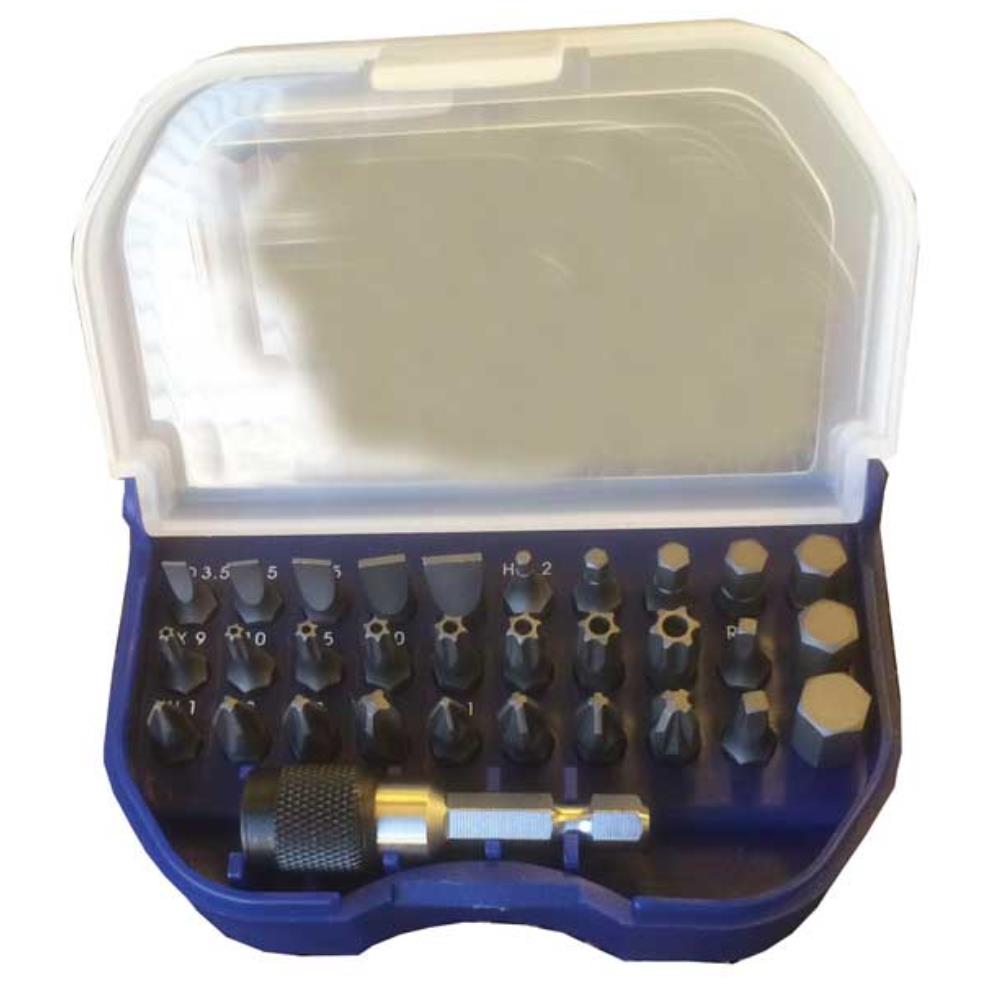 Bitshållare med snabbfäste och roterande mantel samt 30 st bits i behändigt plastetui med bältesklämma
