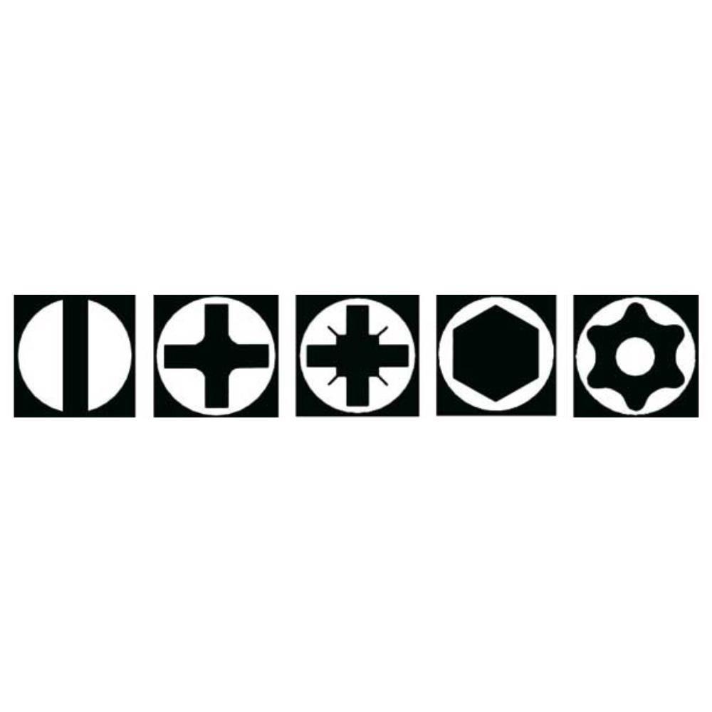Torx med hål: T9 – T10 – T15 – T20 – T25 – T27 – T30 – T40