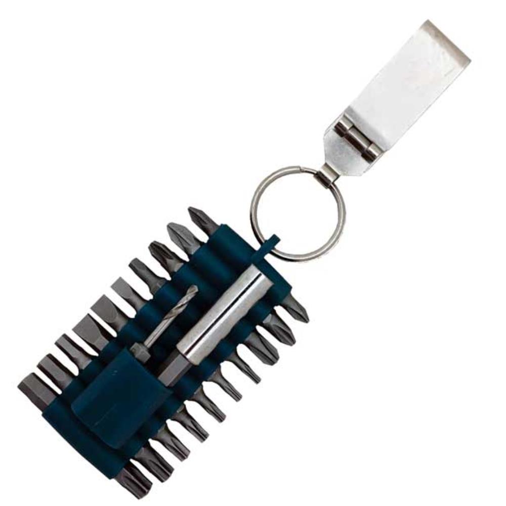 Bitsmatta tillverkad av gummi med bältesclips. Innehåller 20 st bits , bitshållare ¼” samt borr med bitsfäste 3mm. Material i bits: S2