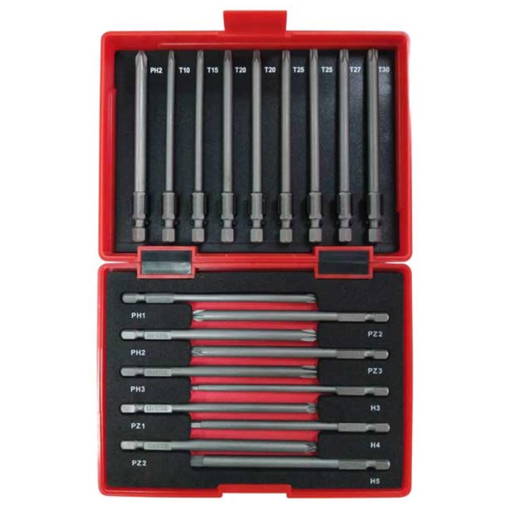Sats med 19 st 100 mm långa bits i praktisk förvaringsask.