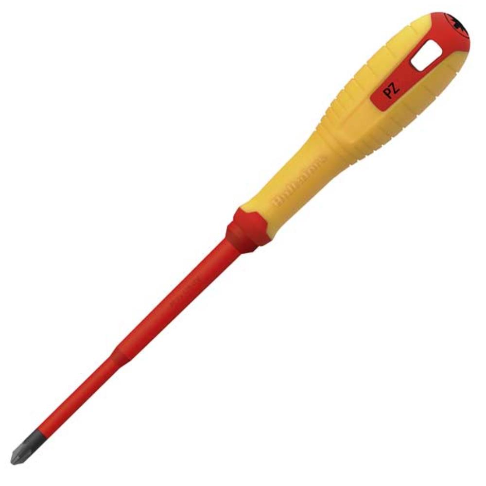 Pozidriv. Isolerad spårmejsel med extra smal klinga framtill för bättre åtkomlighet. Ergonomiskt handtag med rullstopp och ett säkert gummigrepp. Permanent märkning av spetsmodell på handtagets topp. Godkänd enligt IEC 60900 – 1000V
