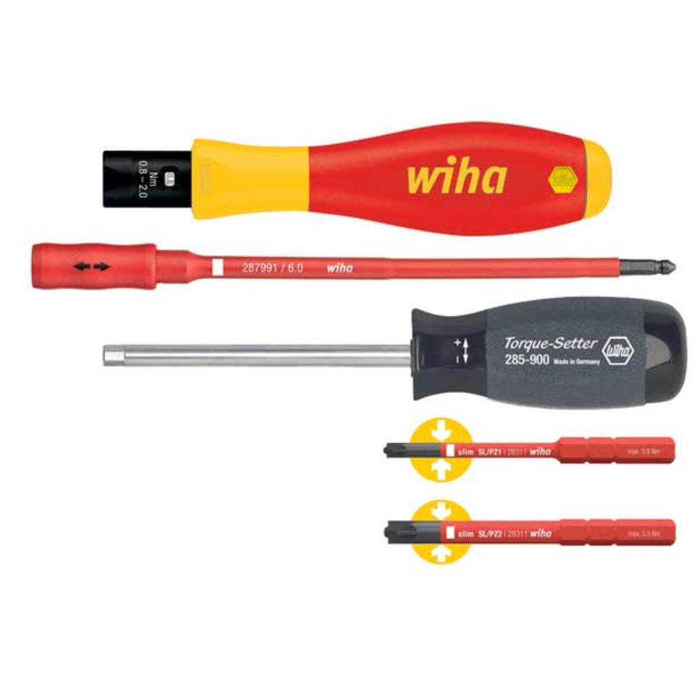 Ett isolerat kit med steglös inställbar momentmejsel 1,0 – 5,0 Nm och 2 st slimline bits för kombinationsskruv PZ1 och PZ2 samt inställningsverktyg. Godkänd för 1000VAC enl IEC60900:2004.