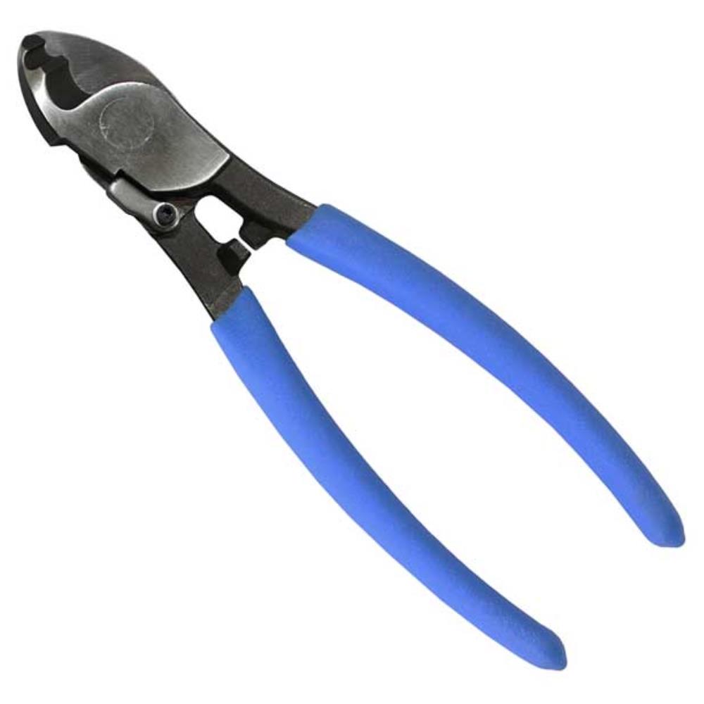 Återfjädrande kabelsax som gör att tången öppnar av sig själv. Med dubbla käftar som klipper och skalar koppar- och aluminiumkabel. Låsfunktion vid stängt läge, behöver inte låsas upp, bara att trycka ihop handtagen så öppnar den sig.