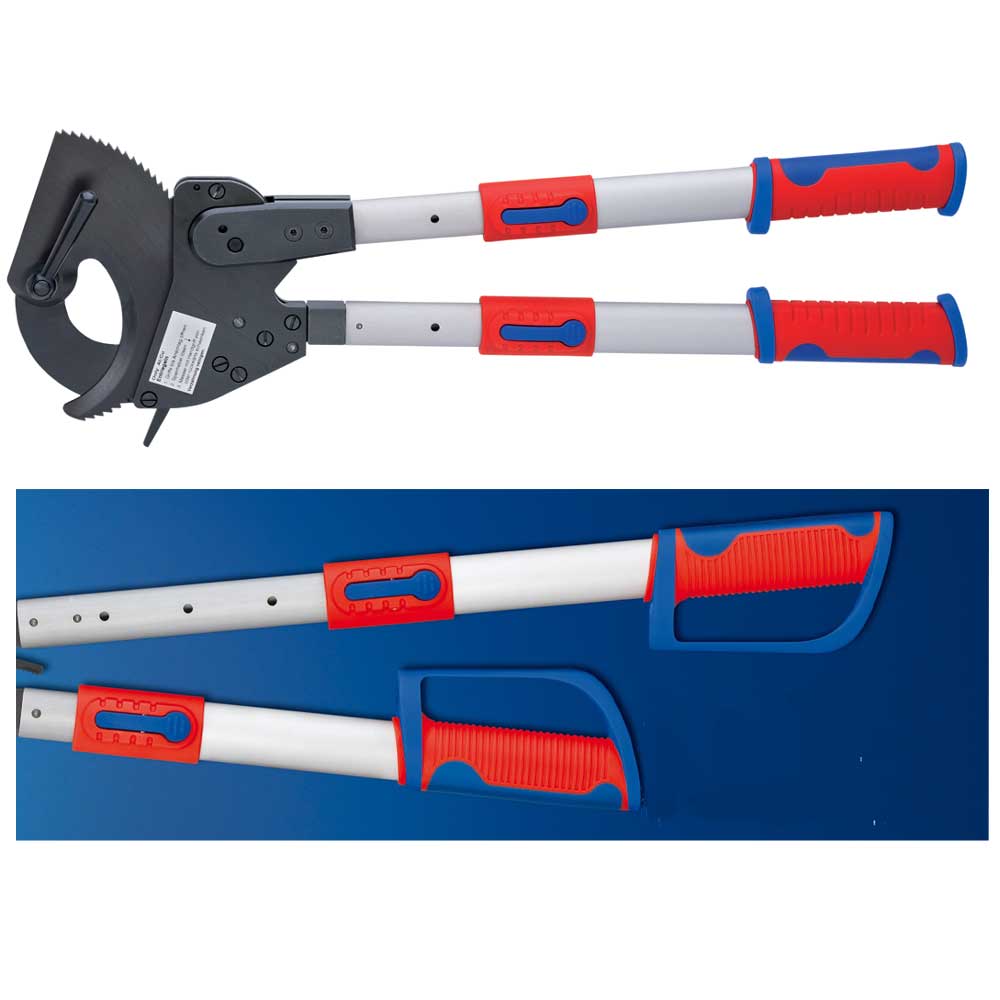För koppar och aluminiumkabel. Skänklarnas längd justerbara i flera steg. Med optimala utväxlingsförhållanden som ger kraftsparande klippning. Verktyget kan öppnas i varje skärposition.