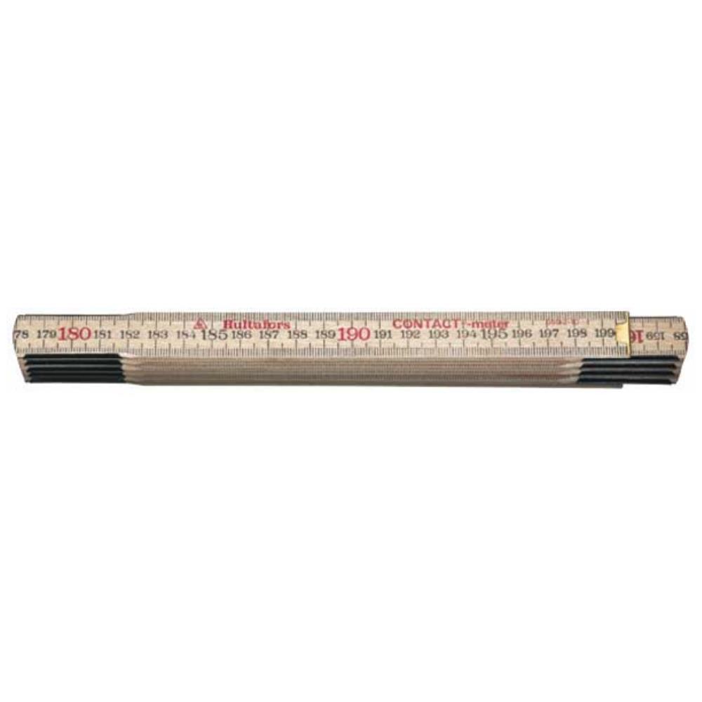 Contact-meter Meterstock tillverkad av glasbjörk med invändig metrisk gradering på båda sidor och röda decimetersiffror. Tumstocken ligger plan vid mätning även när den inte är helt utfälld. Vattenbaserad skyddslack. Värmebehandlad och epoxylackerad led av svenskt stål. EU Klass III.