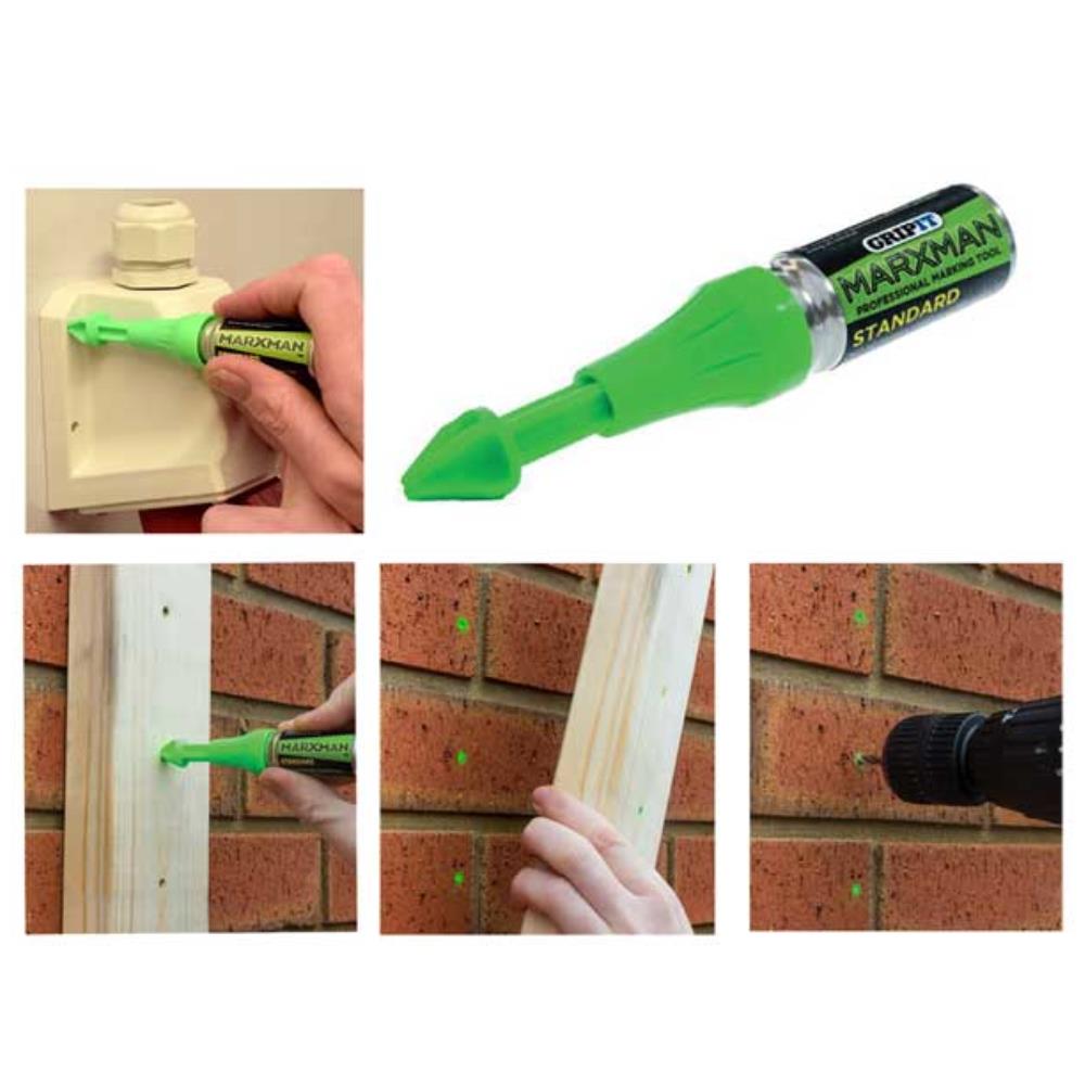 Spraypenna som gör ”spraypuffmarkeringar” av borttagbar fluorescerande grönt pigment. Med specialmunstycket kan man skjuta färgen genom ett hål eller direkt mot en yta för att göra en markering. Fäster på alla ytor inklusive skrovliga ytor som t.ex tegel, putsytor, metall, trä m m