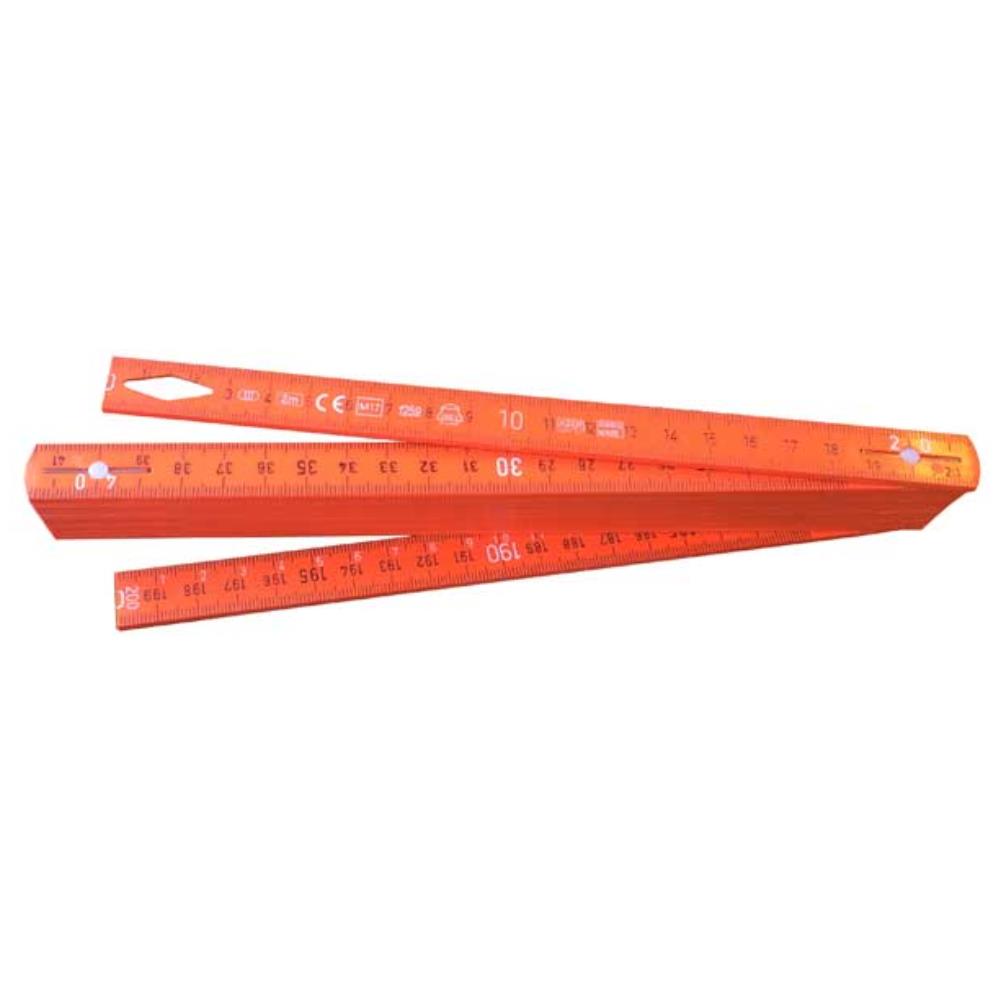 Tillverkad i glasfiberförstärkt polyamid. Med ett koniskt hål för att enkelt kunna fästa kabel. Gradering för rätt avstånd mellan doshål. Har tuff skarp orange färg som gör den lätt att hitta samt gör den svarta skalan lättavläst. Har även en ”extra invändig” gradering som gör att tumstocken kan ligga plant vid mätning även om den inte är helt utfälld.