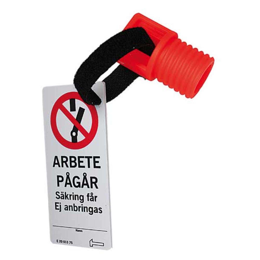 Spärrpropp med ”ARBETE PÅGÅR” skylt för blockering av säkring/säkringsgrupp i central.