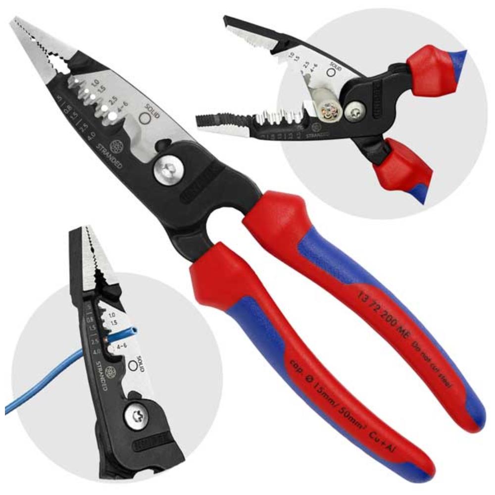 Flerfunktions hybridtång för elinstallationer: klippa, skala, vrida, avgrada och greppa kabel. Lika platt som en spetstång för god åtkomlighet, lite bredare käftar för ett bra grepp. Precisionsslipade skalprofiler för solida ledare mellan 0,75 och 6 mm² och fintrådiga ledare mellan 0,5 och 4 mm². Krysstandade greppytor för att tvinna tråd. Fräst spår för i greppområdet för säker hållning.