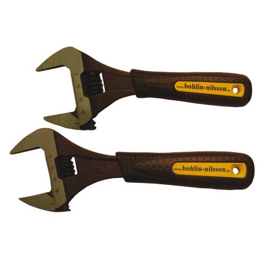 Skiftnyckel med tunna käftar och gummihandtag för ett bra grepp. Stor nyckelvidd i förhållande till längden.Måttskala.