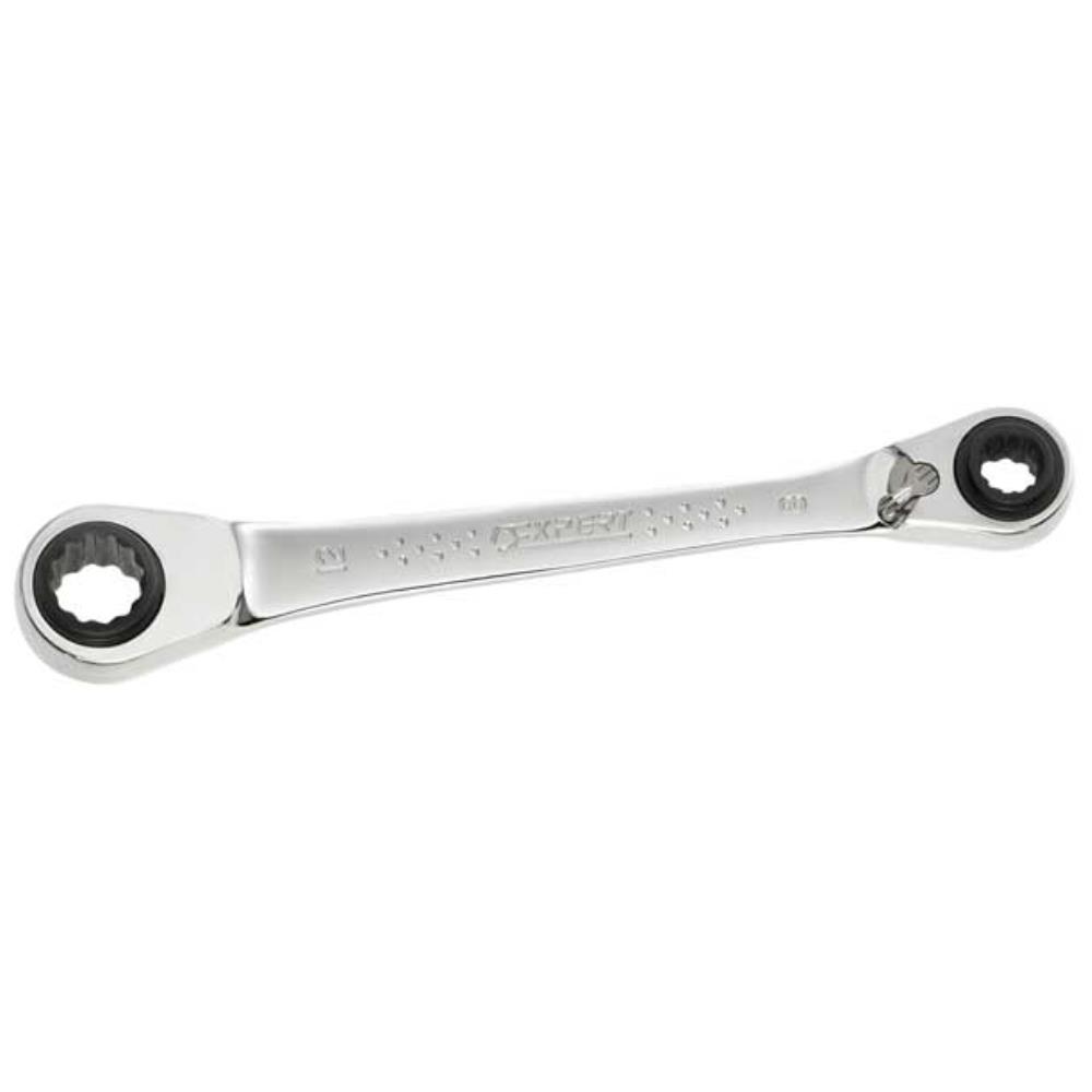 Mycket smart och behändig spärringnyckel med fyra dimensioner i en nyckel = dubbla storlekar i varje ände. Spärrfunktionen för höger- och vänsterdragning sköts enkelt med en hand.