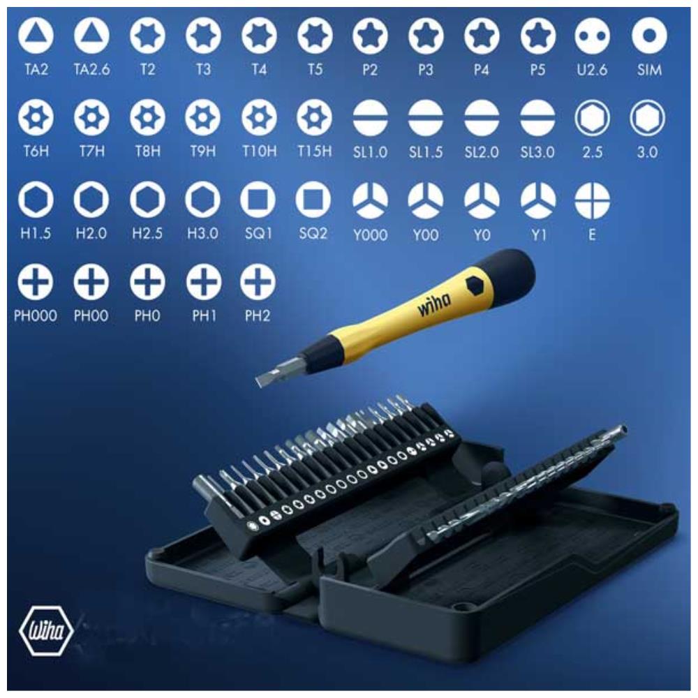 40 st microbits i alla möjliga olika spårvarianter för småskruv. Perfekt till allt inom elektronik eller att fixa till glasögonen. ESD skyddat Bitsmejselhandtag med snurrtopp. Levereras i smart förvaringsask där bitsen sitter fast med magnet.