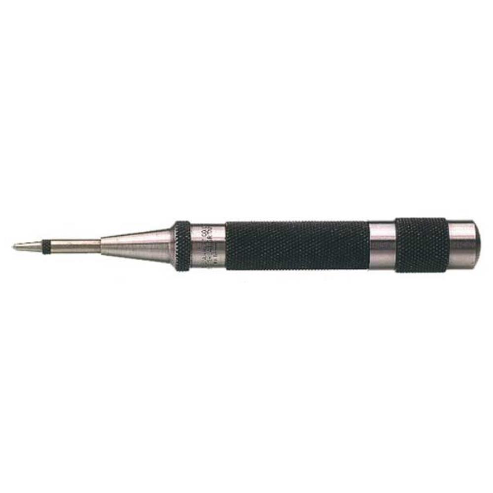 Med ställbart, fjädrande slag. Fjädern spännes och utlöses vid tryck mot spetsen. Lettrat skaft.