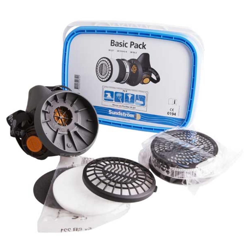 Boxen innehåller halvmask SR 90-3 M/L, partikelfilter SR 510 P3 R, 5 st förfilter SR 221, förfilterhållare, rengöringsservett och bruksanvisning.