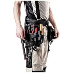 Ergonomiskt verktygsbälte med flexibelt infästningssystem för fickor.Justerbara och avtagbara hängslen som är vadderade, minskar vikten på höfterna.Verktygsficka för elektriker med hammarhållare samt fack för mejslar, tänger, knivar instrument mm. Två slitstarka materialfickor med breda öppningar för enkel åtkomst. Robust aluminiumspänne för enkel öppning och stängning. Material: Bälte i Nylon, Cordura och Polyamide. Verktygsfickor i läder med dubbla sömmar förstärkt med nitar.