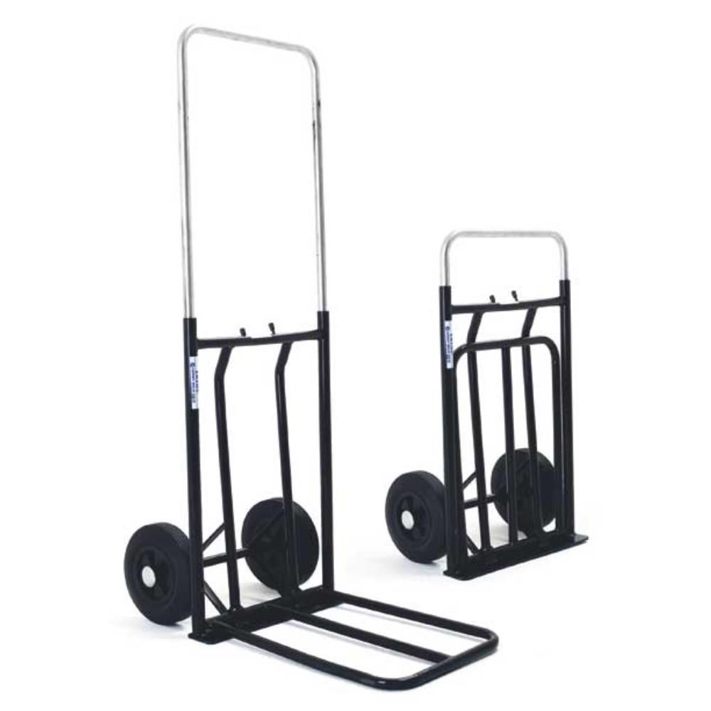 Kärra med fällbar lastplattform. Brännlackerade stålrör. Punkteringsfria massivgummihjul med glidlager.