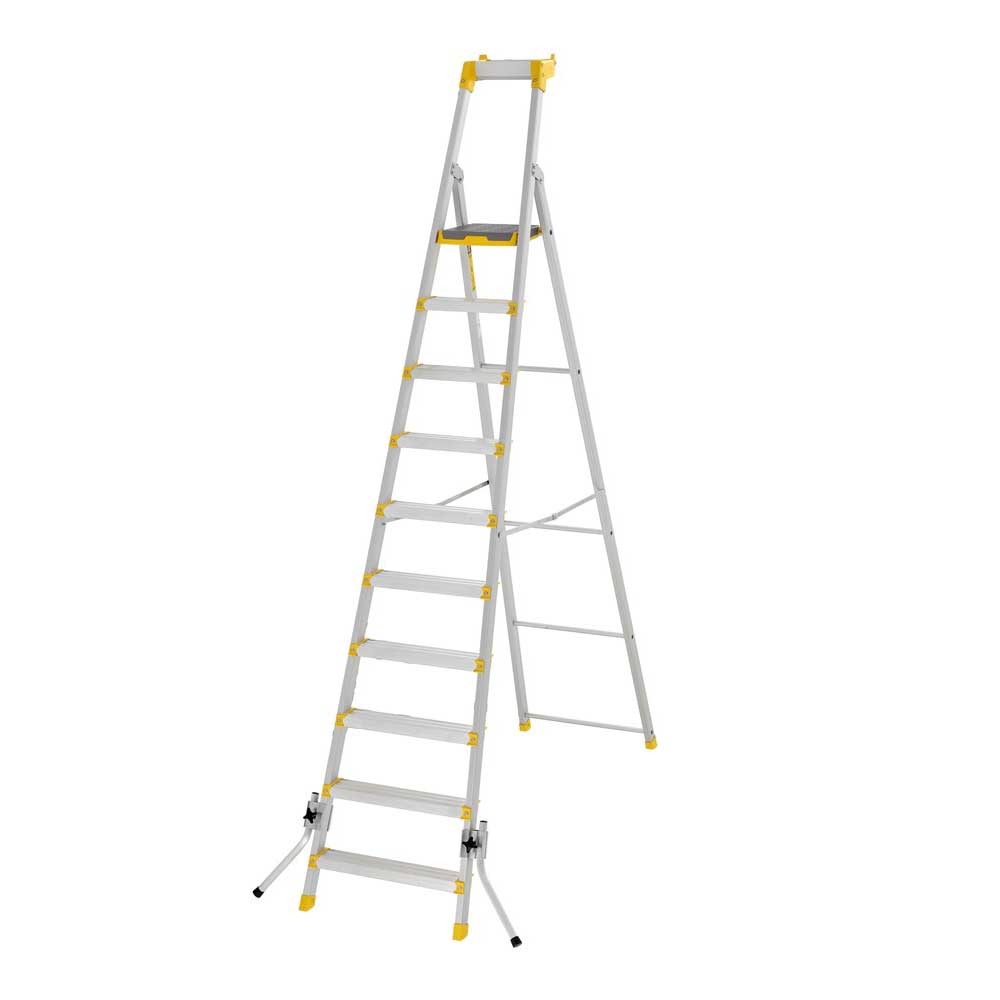 En robust proffsstege med rejäl plattform (310 x 270 mm) i metall med dubbelriktat halkskydd. Ergonomiska stegfronter att luta smalbenen mot och greppvänliga profiler gör stegen både lättburen och bekväm att arbeta med. Verktygshylla skruvad direkt i sidoprofilerna för ökad hållbarhet. Aluminiumprofilerna är anodiserade så att du inte svärtar ner dina händer.
