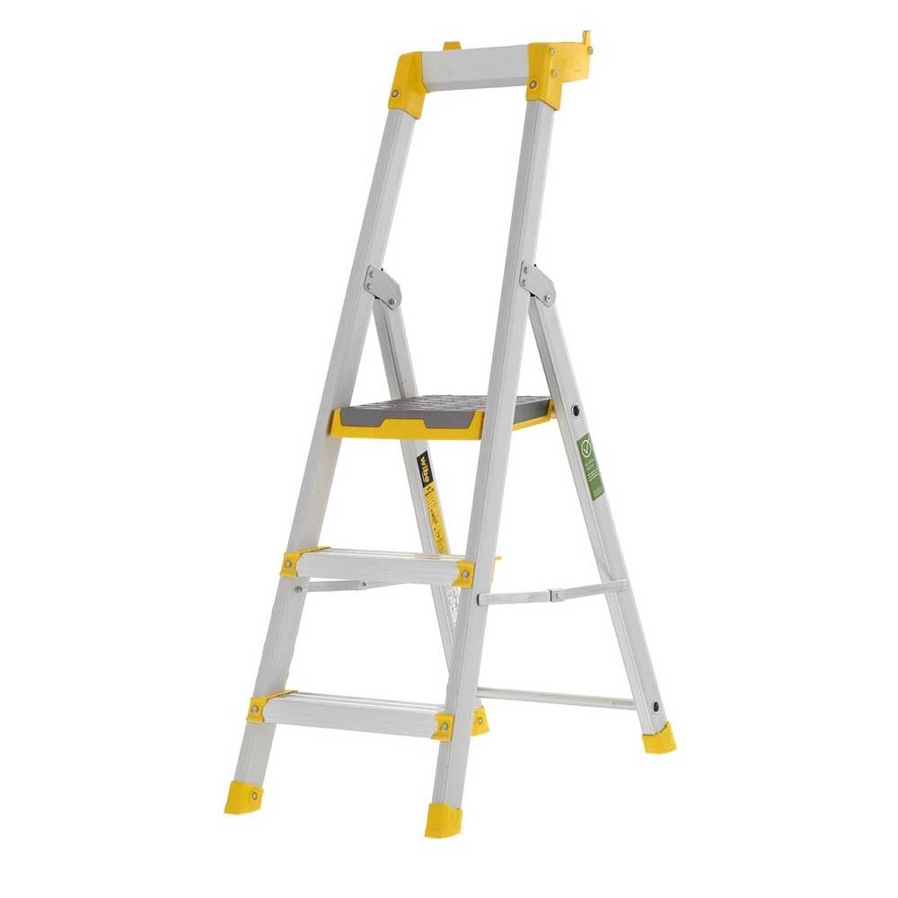 En robust proffsstege med rejäl plattform (310 x 270 mm) i metall med dubbelriktat halkskydd. Ergonomiska stegfronter att luta smalbenen mot och greppvänliga profiler gör stegen både lättburen och bekväm att arbeta med. Verktygshylla skruvad direkt i sidoprofilerna för ökad hållbarhet. Aluminiumprofilerna är anodiserade så att du inte svärtar ner dina händer.