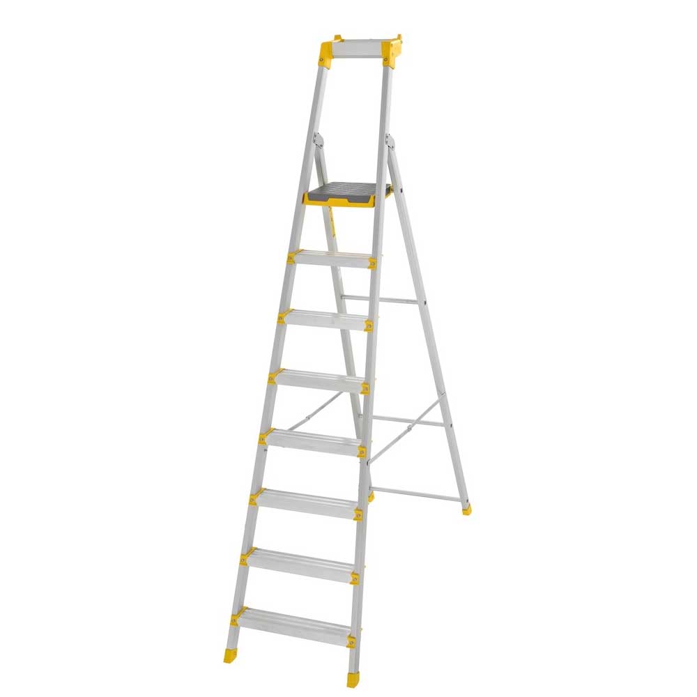 En robust proffsstege med rejäl plattform (310 x 270 mm) i metall med dubbelriktat halkskydd. Ergonomiska stegfronter att luta smalbenen mot och greppvänliga profiler gör stegen både lättburen och bekväm att arbeta med. Verktygshylla skruvad direkt i sidoprofilerna för ökad hållbarhet. Aluminiumprofilerna är anodiserade så att du inte svärtar ner dina händer.